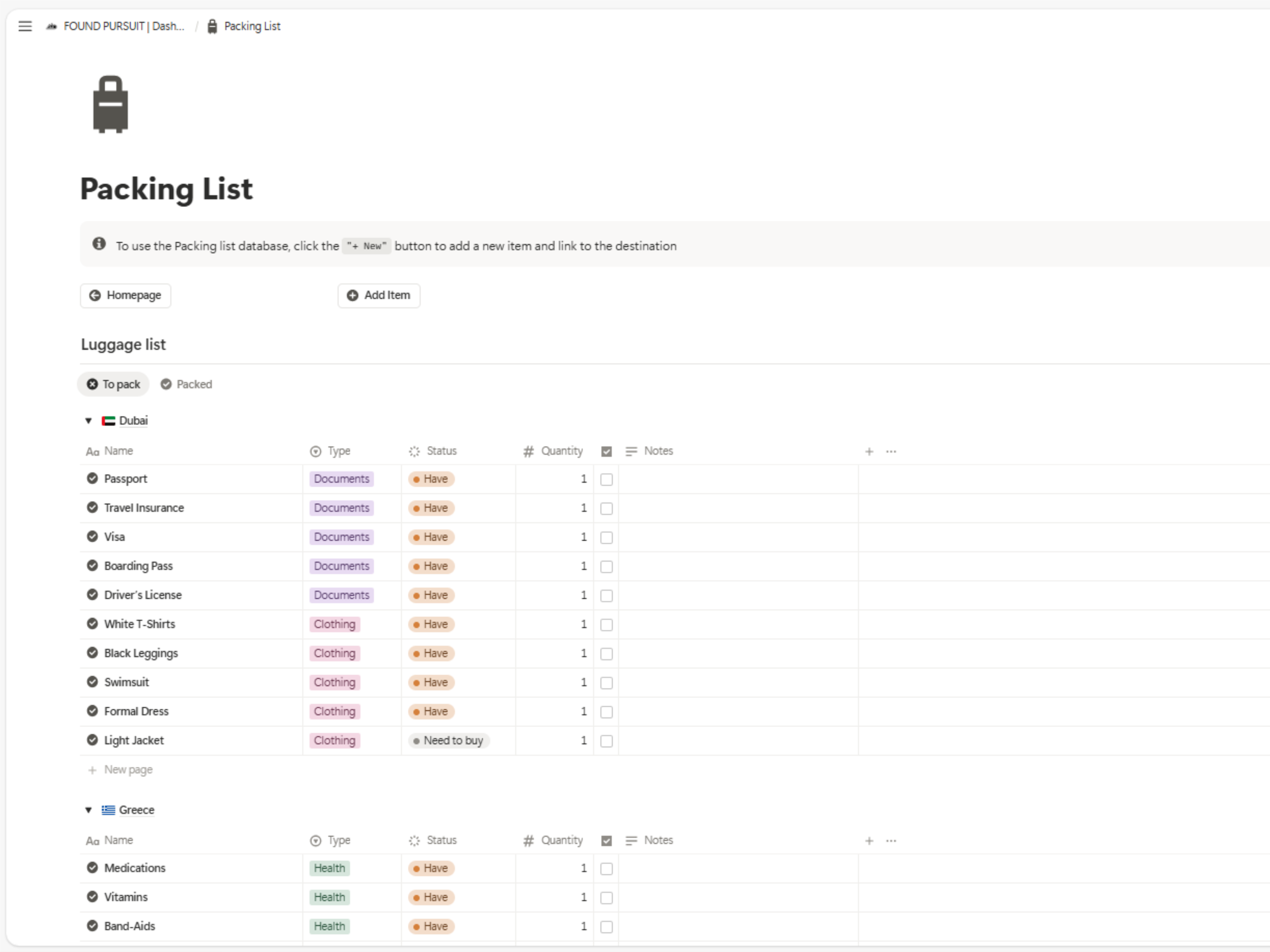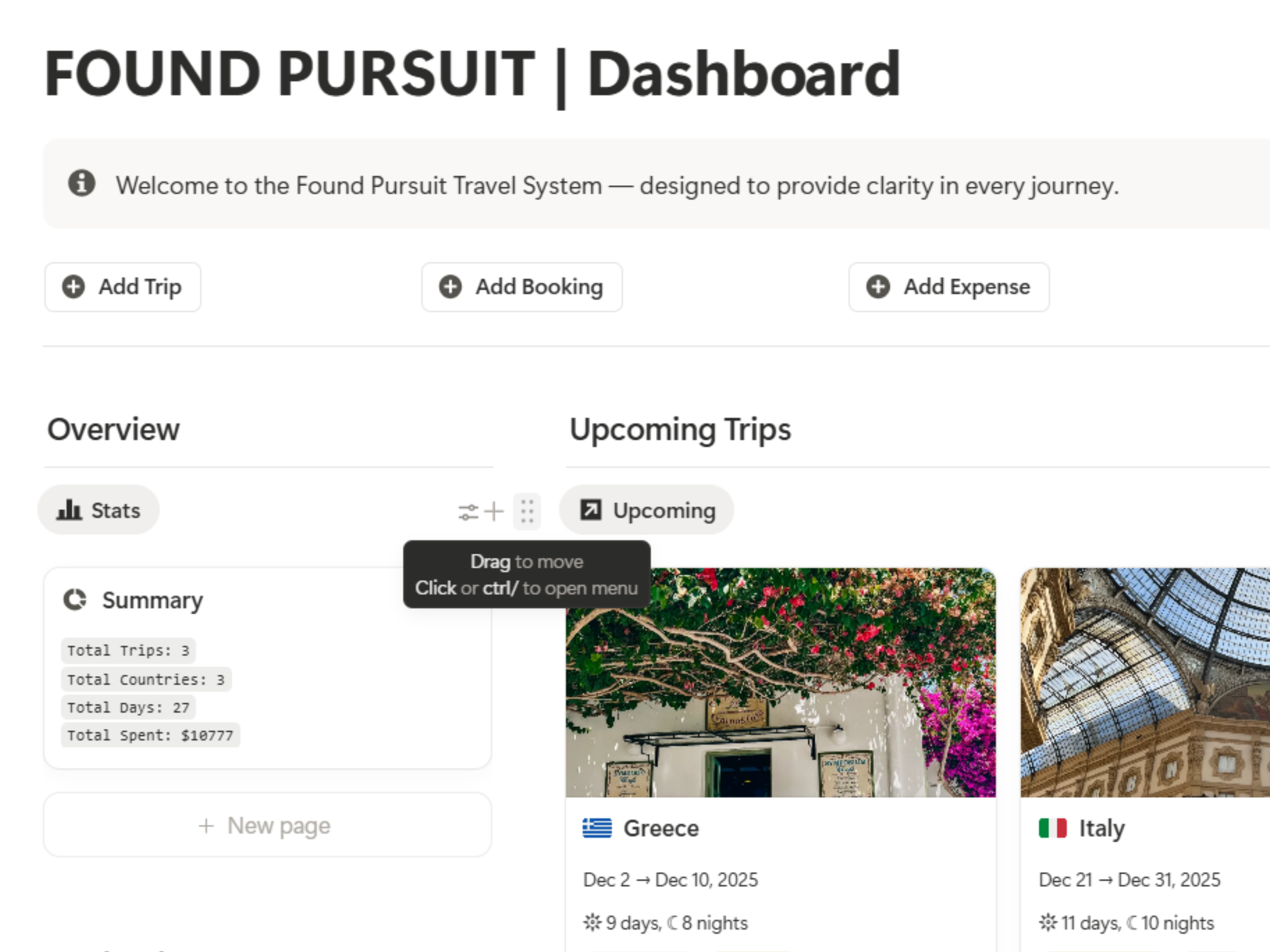 The Found Pursuit Travel System is a design-led planning system built in Notion.